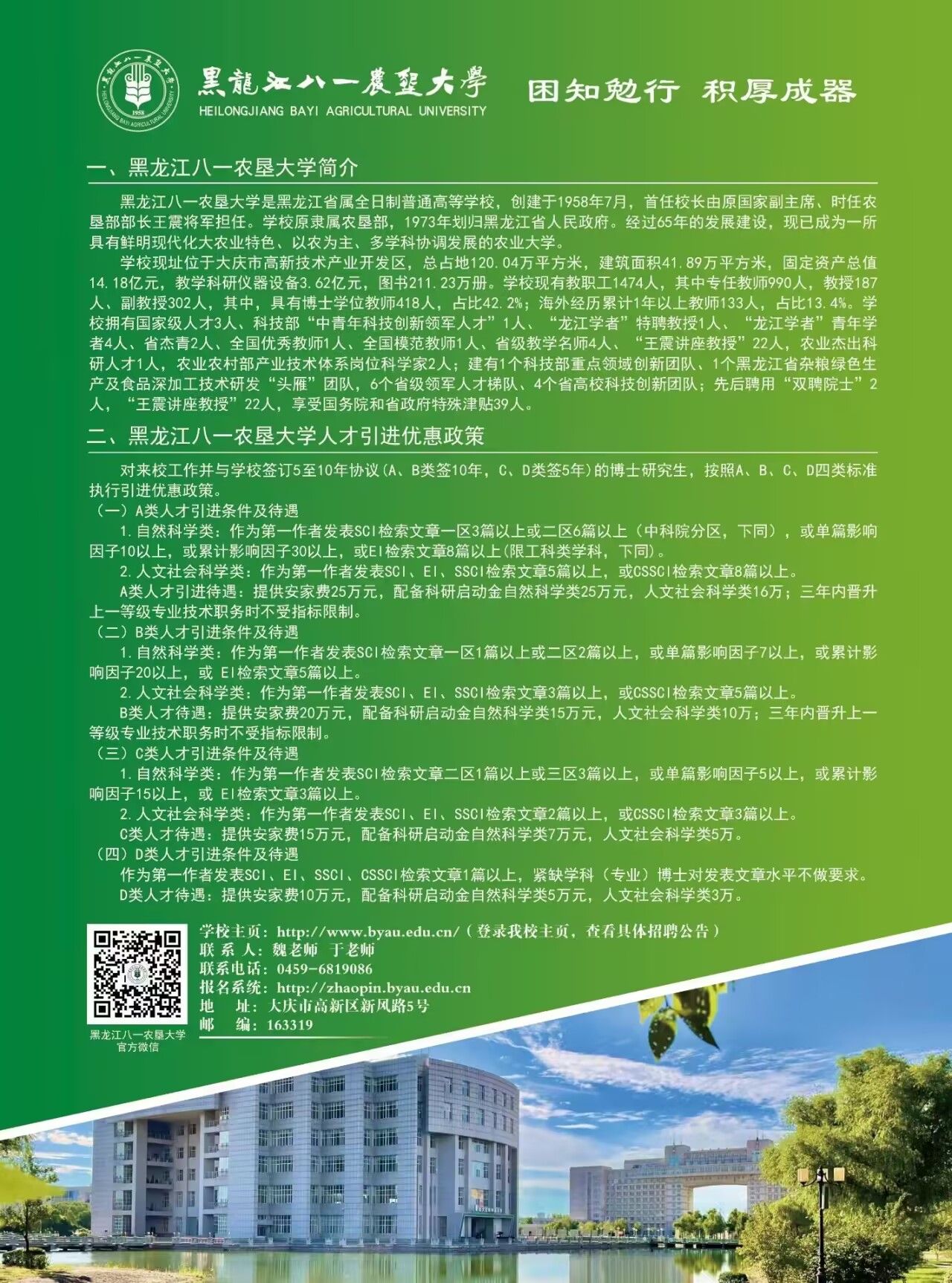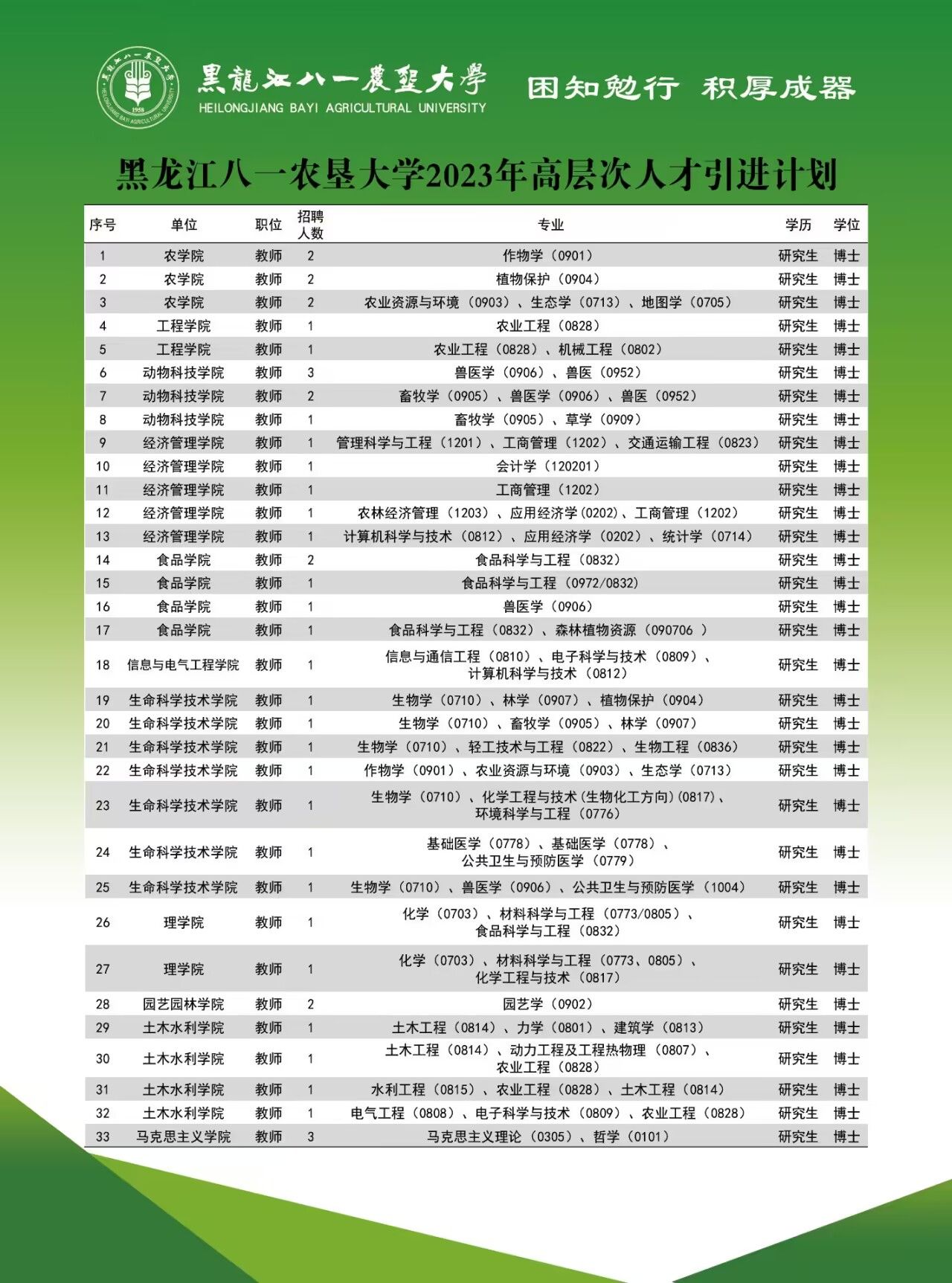 就业信息:黑龙江八一农垦大学2023年高层次人才引进公告