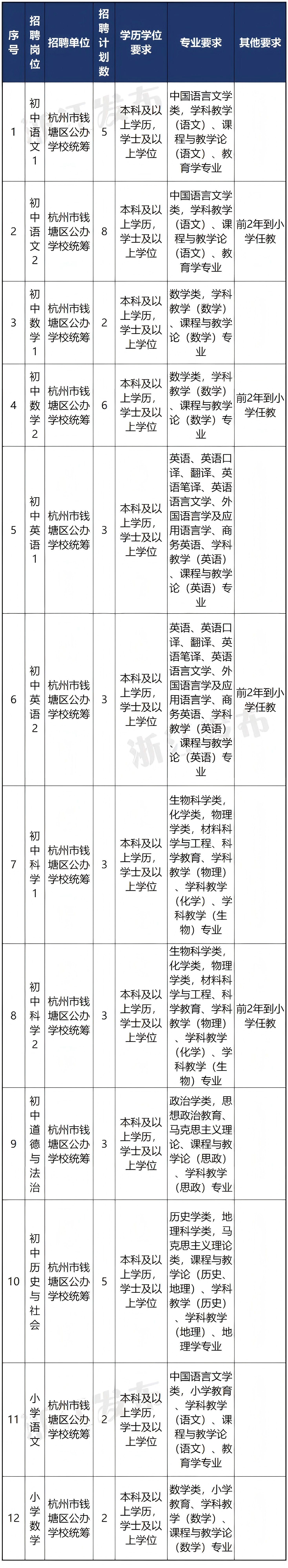 因工作需要,杭州市钱塘区教育系统公办中小学面向2025年本科及以上优秀应届毕业生公开招聘事业编制教师45名。招聘录用的人员均为财政补助事业单位公办教师。