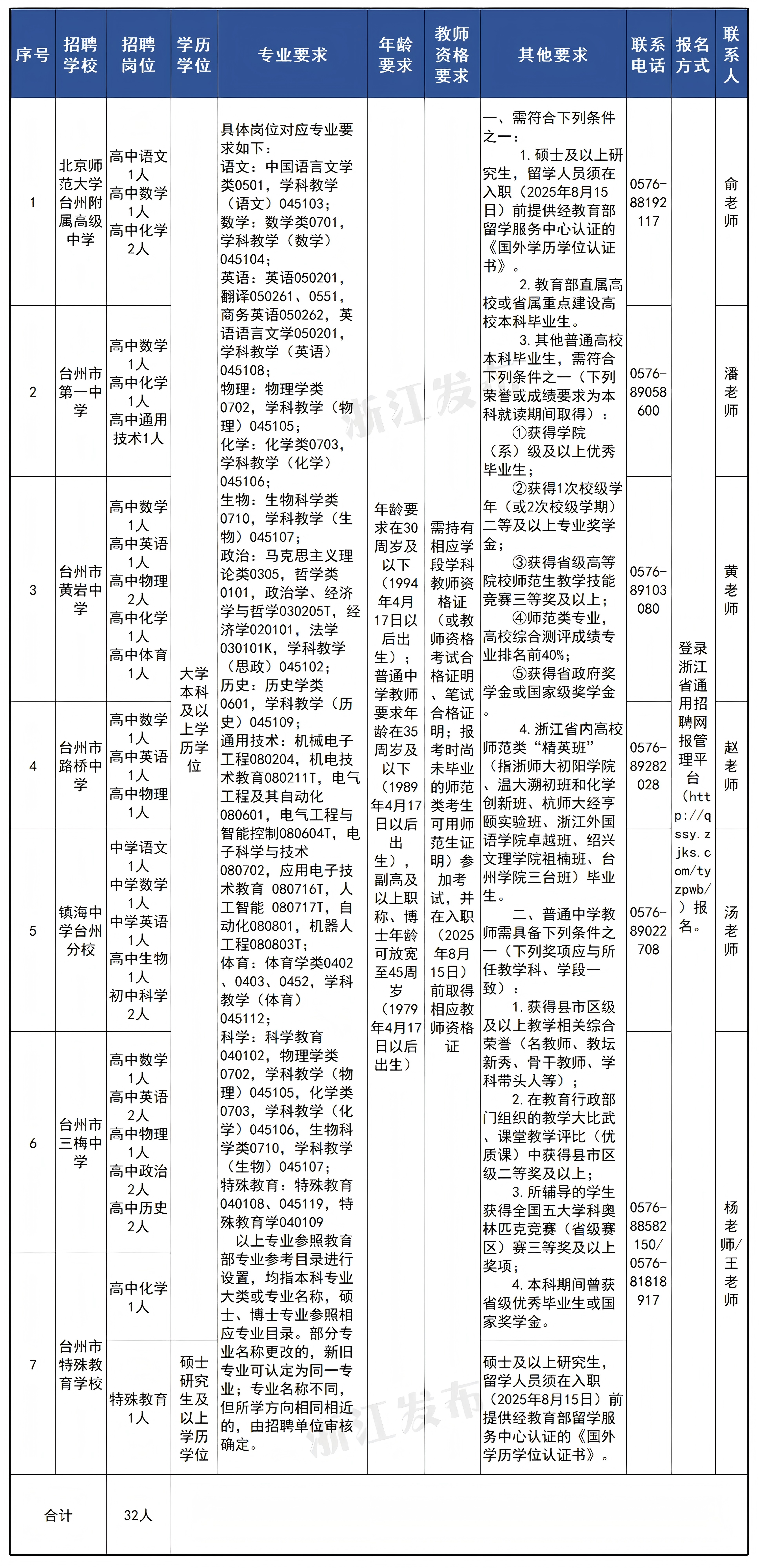 台州市教育局直属学校决定面向社会公开招聘教师32名。