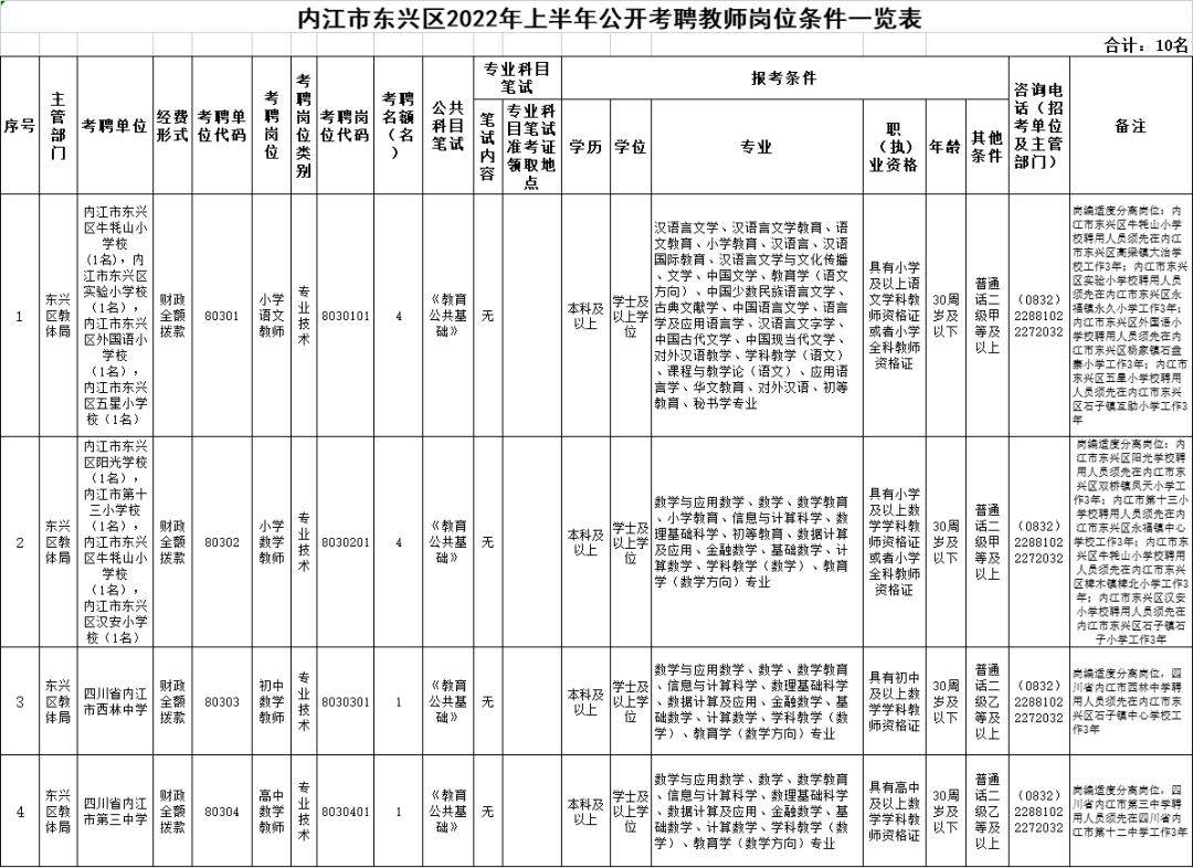 根据《事业单位人事管理条例》、《四川省事业单位工作人员招聘工作试行办法》(川人发〔2006〕9号)、《安博首页_安博(中国)进一步规范事业单位公开招聘工作的通知》(川人社发〔2011〕36号)及《事业单位公开招聘违纪违规行为处理规定》(人力资源和社会保障部令第35号)等法规文件规定,按照“公开、平等、竞争、择优”的原则,2022年上半年内江市东兴区将面向社会公开考试招聘教育系统教师10名,现将有关事项集中公告如下: