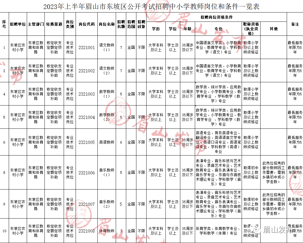 根据四川省人力资源和社会保障厅、四川省教育厅《安博首页_安博(中国)做好2023年全省面向社会公开考试招聘中小学教师工作的通知》(川人社函〔2023〕126号)等文件精神,我市2023年上半年面向社会公开考试招聘中小学教师177名,其中:东坡区50名、彭山区20名、仁寿县33名、洪雅县30名、丹棱县32名、青神县12名。