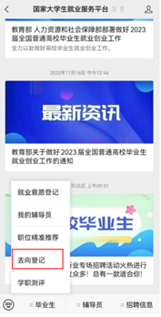 毕业生关注绑定“国家大学生就业服务平台”公众号,除了点击“去向登记”可直接登录登记系统外,还可接收到微信消息提醒,包括用人单位发起的签约邀请、学校(院系)的审核结果、去向登记信息被修改等,方便及时掌握去向登记进度。