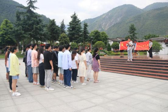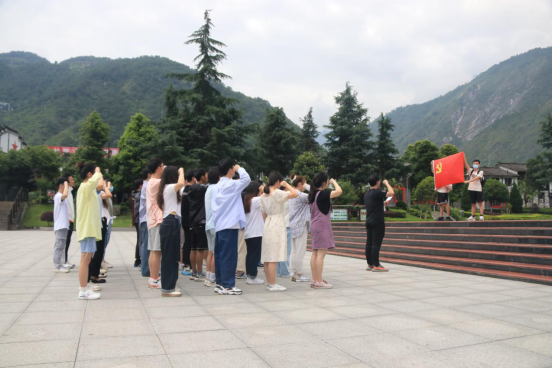 在纪念馆前的广场上,中国工农红军强渡大渡河纪念碑巍然矗立。碑体正面为半圆雕红军战士塑像,炯炯双眼凝视对岸;下半部则展现了十七勇士驾着当地特有的翘首木舟乘风破浪,飞渡天险的场景。纪念碑前,全体党员举起右拳,面向党旗,在支部书记竭志昊同学的带领下,重温入党誓词,庄严地许下“为共产主义奋斗终身,随时准备为党和人民牺牲一切,永不叛党”的承诺。