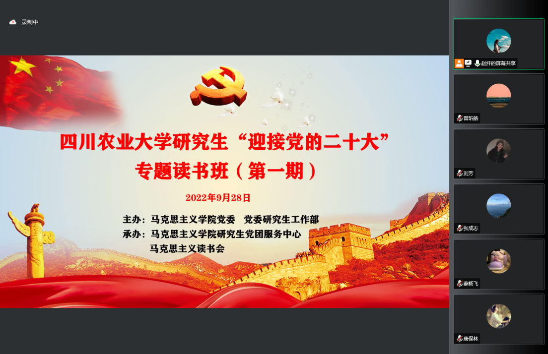 2022年9月28日下午,由马克思主义学院党委和党委研工部共同主办的四川农业大学研究生“迎接党的二十大”专题读书班(第一期)于腾讯会议线上顺利开展。